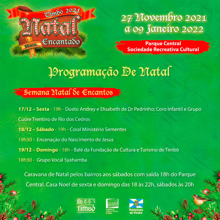 A programação na Sociedade Recreativa Cultural no domingo, dia 19, inicia às 18h com o Balé da Fundação de Cultura e Turismo de Timbó. A partir das 18h30, o Grupo Vocal Syahamba fecha a programação natalina.