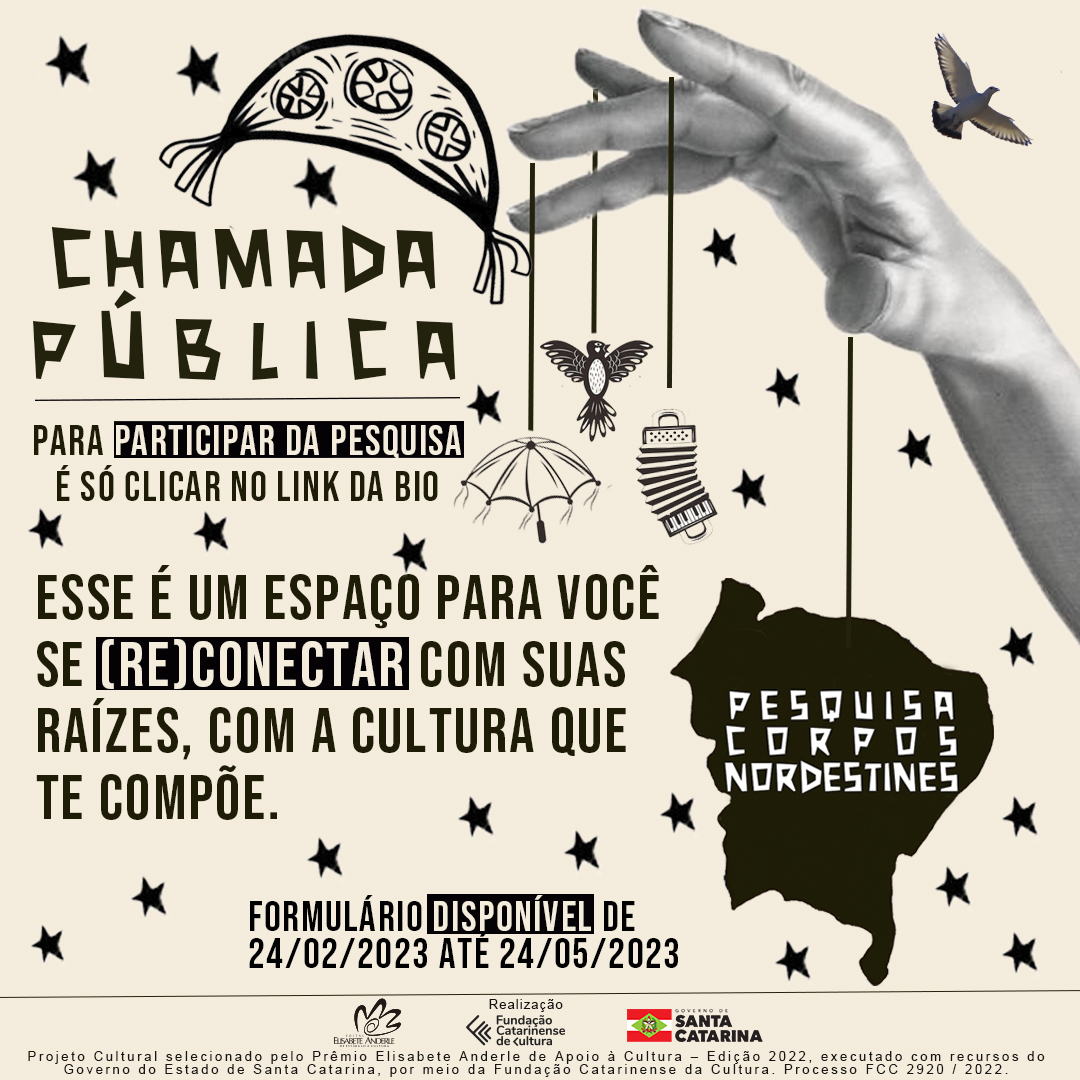 O Projeto Cultural Nº 000616, Pesquisa – Corpos Nordestines, de João Alves Jr. é contemplado pelo Prêmio Elisabete Anderle de Estímulo à Cultura – Edição 2022 – Prêmio Artes Populares / Culturas Populares e Diversidades. A pesquisa online ficará disponível até o dia 25 de maio. Acompanhe as novidades pelo instagram.com/pesquisa_corposnordestines