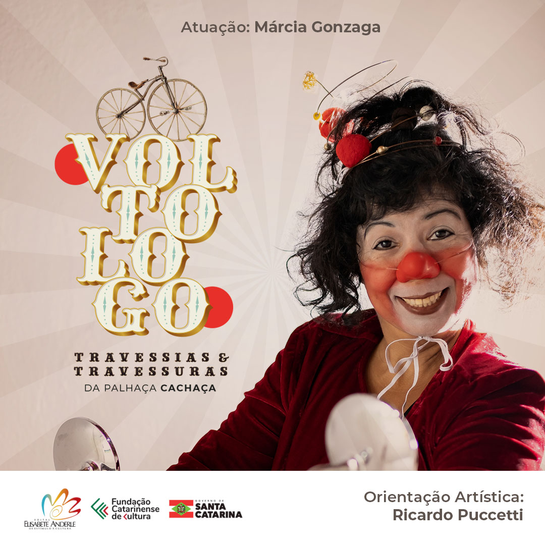 Uma palhaça em uma bicicleta, intervenção urbana, e arte circense para a comunidade. A partir de abril, cinco cidades de Santa Catarina irão receber o projeto Volto Logo: Travessias e Travessuras da Palhaça Cachaça (interpretada pela atriz, palhaça e produtora cultural, Márcia Gonzaga). Serão seis (6) intervenções da palhaça em sua bicicleta pelas ruas dos municípios de Ilhota, Luíz Alves, Guabiruba e Brusque (com uma hora e meia de duração em cada intervenção). Como contrapartida social, o projeto ainda levará mais quatro (4) interações para a cidade de Gaspar, pelos bairros de Bela Vista, Santa Terezinha, Bateias e Sertão Verde; além de realizar uma live de debate sobre “Palhaçaria como Intervenção no Espaço Público: Como criar dispositivos de improviso?”, mediada pelo renomado artista Ricardo Puccetti (LUME – Campinas/SP), com uma hora de duração. Todas as ações são gratuitas e abertas a toda comunidade.