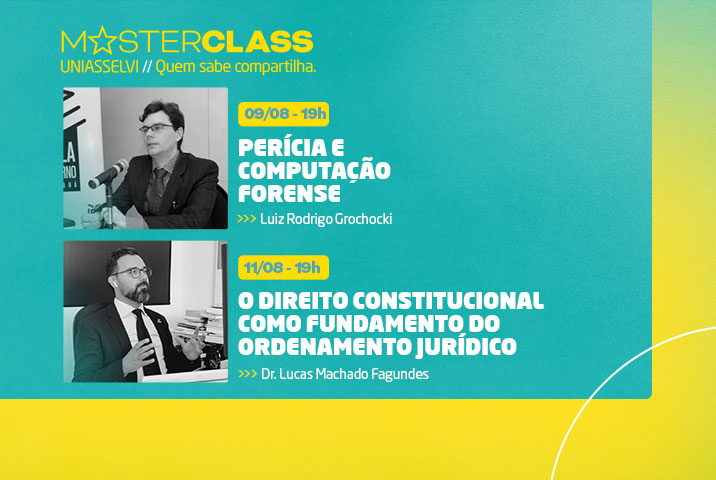 Perícia e Computação Forense é o assunto abordado na primeira MasterClass, quem falará será o MSc. Luiz Rodrigo Grochocki, Diretor da Polícia Científica do Paraná (PR). Já a do dia 11 de agosto, será apresentada pelo Dr. Lucas Machado Fagundes com a abordagem O Direito Constitucional como Fundamento do Ordenamento Jurídico.