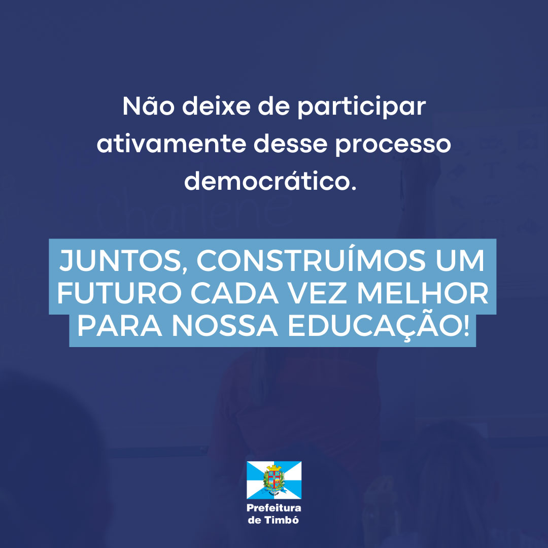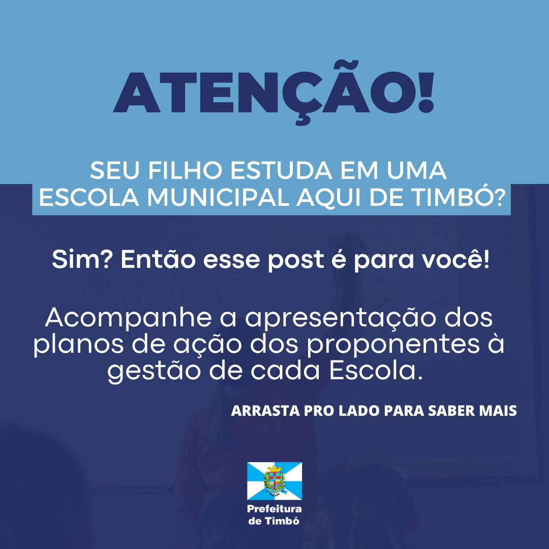 Você confere a lista completa das equipes proponentes para cada Escola, aqui: www.timbo.sc.gov.br/wp-content/uploads/2023/08/Inscricoes-Homologadas-Final-Edital-001-SEMED.pdf Nos mês de agosto, estas equipes participaram da Escola de Gestores, um treinamento para estarem ainda mais preparados para elaborarem seus planos de ação.