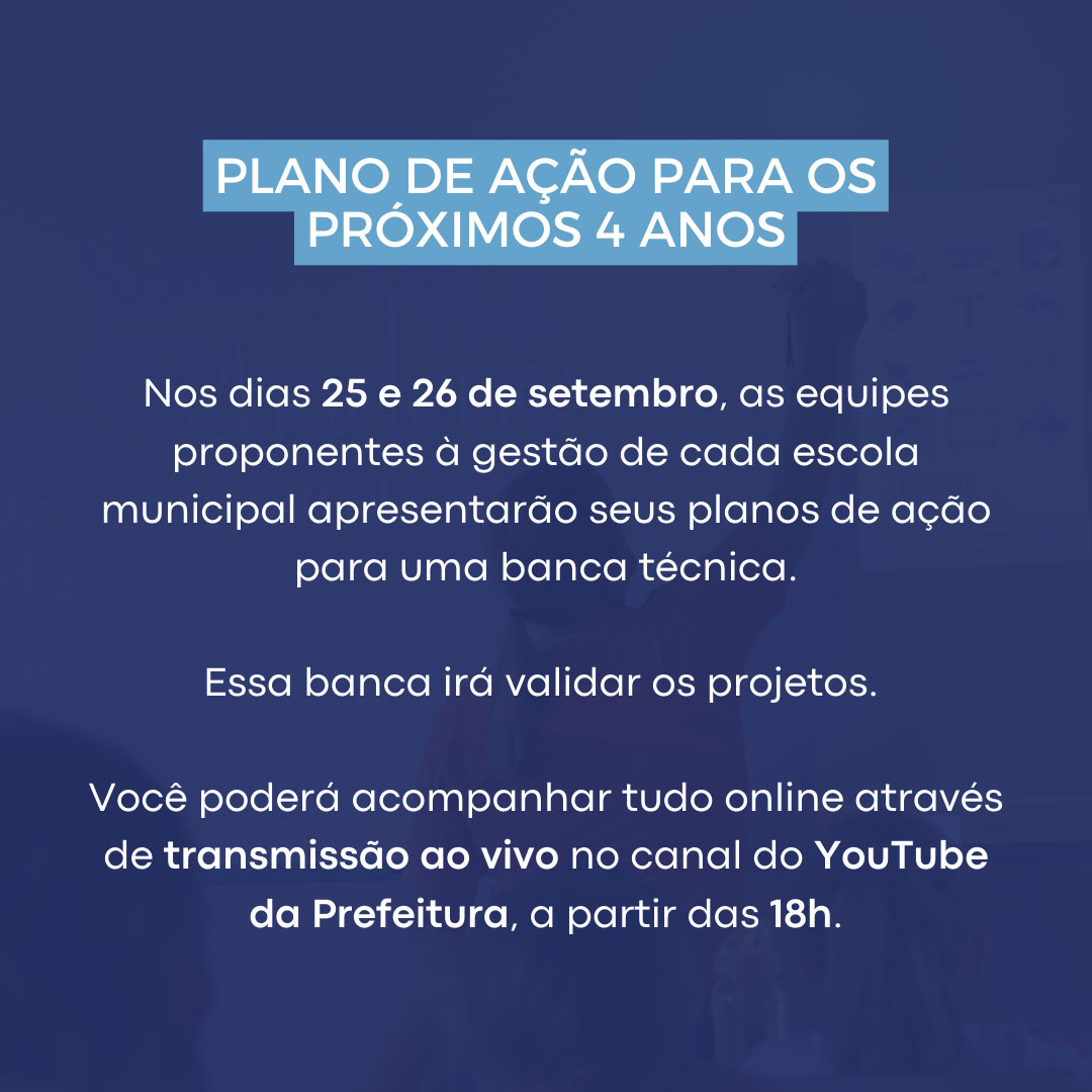 Esta é mais uma etapa do Processo de Qualificação para o exercício do cargo de Diretor Escolar e funções de Auxiliar de Direção e Coordenador Pedagógico das Escolas Municipais. Este processo de qualificação é regulamentado a partir do Decreto Municipal nº 6588, de 07 de outubro de 2022, que, por sua vez, é regido por legislação federal que prevê a gestão democrática do ensino público.