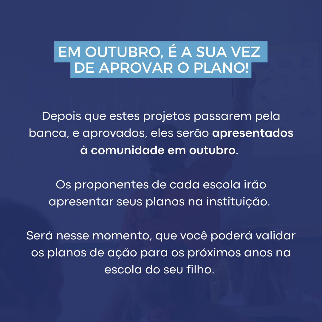Depois da aprovação pela banca, os projetos seguem para serem aprovados pela comunidade, no mês de outubro. O objetivo é que as famílias participem deste momento, validando os planos de ação para os próximos anos. Os projetos aprovados pela comunidade seguirão para escolha final pelo prefeito Jorge Krüger.