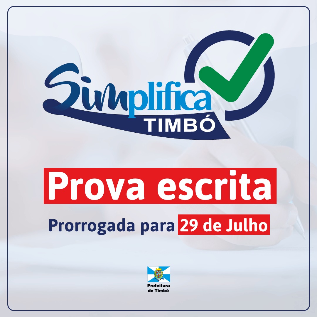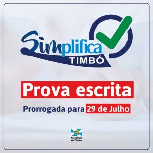 Junho 4, 2020Conforme foi informado pela Prefeitura de Timbó no dia 23 de abril, devido ao fato de as aulas presenciais ainda estarem suspensas, a data da prova escrita do Simplifica Timbó foi alterada para o dia 29 de julho, com possibilidade de ser prorrogada novamente. No total, 232 jovens foram aprovados na primeira etapa (confira os nomes no site oficial da Prefeitura — https://is.gd/seGYZe).