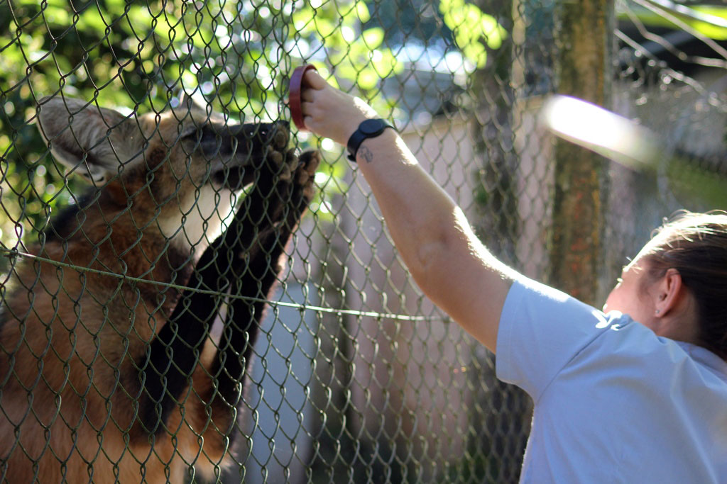 Além de viver em um habitat ideal para o seu desenvolvimento e interagir com outra da sua espécie, o lobo-guará conta com uma alimentação essencial para o seu crescimento saudável. “Ele é um animal onívoro, então ofertamos três vezes ao dia carne vermelha, frango, ovo cozido, ração, maçã, manga, banana e mamão”. O lobinho também conta com diversas atividades de interação, chamadas de enriquecimento, onde recebe objetos, caixas e materiais com diferentes texturas e odores, que o fazem estimular seus instintos. Ele também participa do programa de condicionamento, que trabalha técnicas para que o animal coopere com ações de medicina preventiva, através de reforços positivos.