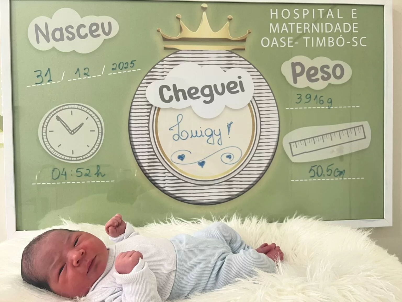 Poucos minutos depois, às 4h52, veio ao mundo Luigy Alves Pinheiro, pesando 3.916 quilos e medindo 50,5 centímetros. Ele é filho de Andressa Alves Pinheiro e Luan Matheus Bonacolsi Bauer, residentes também no bairro das Capitais, em Timbó.