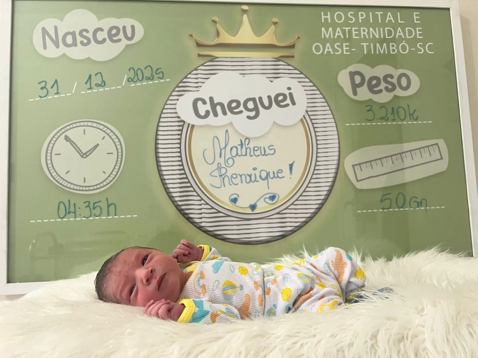 Às 4h35 do dia 31 de dezembro, nasceu Matheus Henrique Burschinski, com 3.210 quilos e 50 centímetros, filho de Stefany Dickmann de Souza e Eduardo Matheus Burschinski, moradores de Rio dos Cedros.