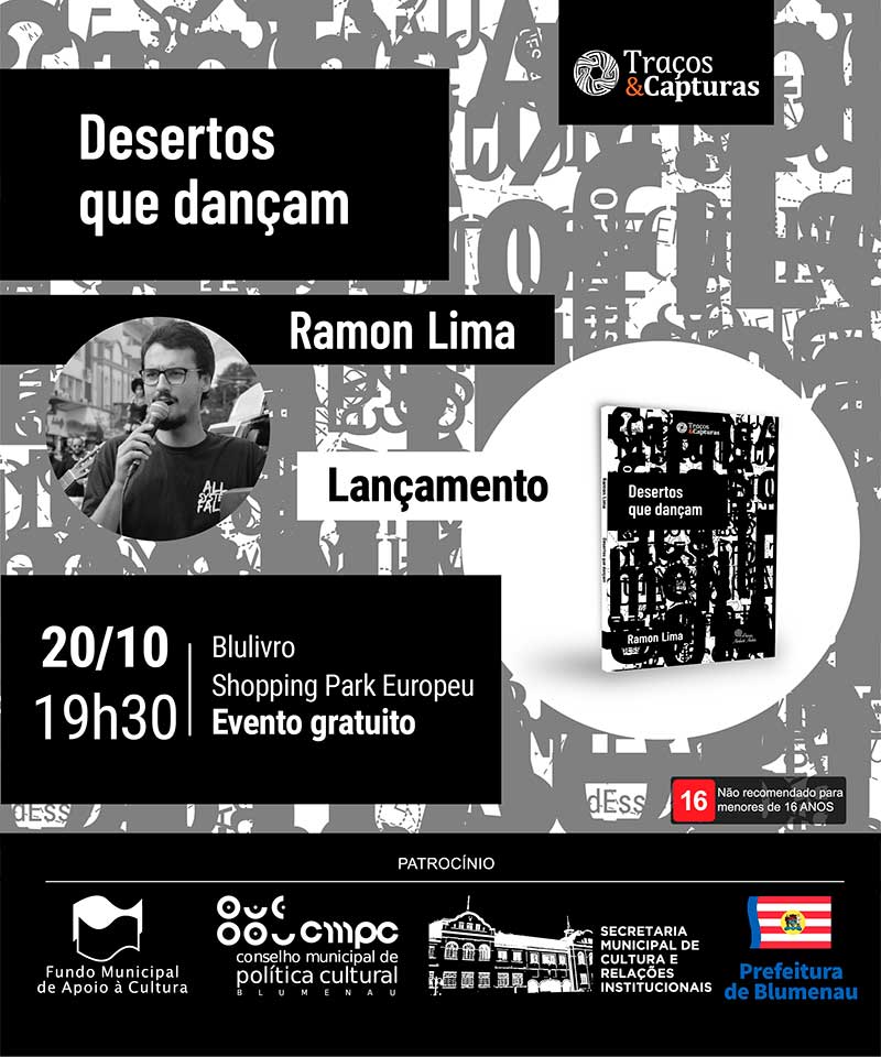 Poesia catarinense. No dia 20 de outubro, quarta-feira, o escritor Ramon Lima faz lançamento presencial e noite de autógrafos do livro Desertos que Dançam – uma coletânea de poemas políticos, sociais, filosóficos e existenciais do autor – na Livraria Blulivro, no Shopping Park Europeu, em Blumenau. O evento ocorre das 19h às 21h com entrada gratuita e aberta à comunidade.