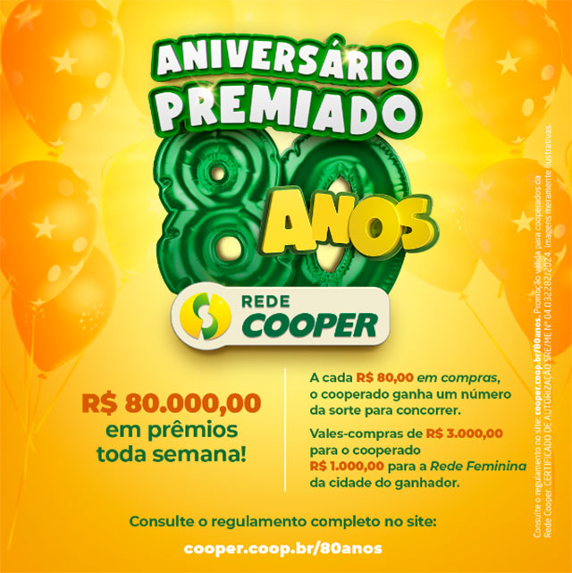 O regulamento completo e os ganhadores estarão disponíveis no site https://cooper.coop.br/80anos/.
