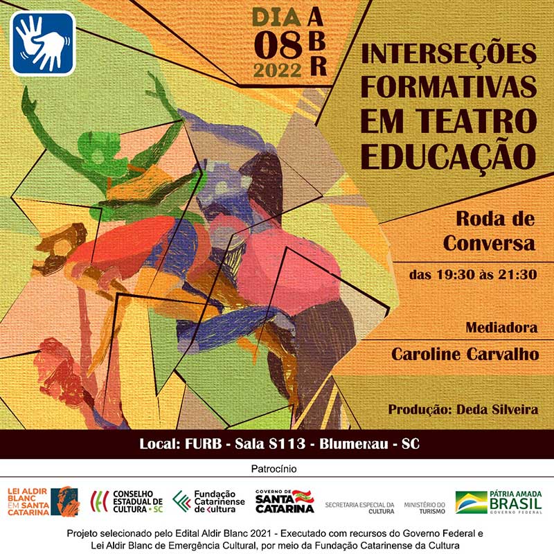 A roda de conversa faz parte da contrapartida social do projeto Interseções Formativas em Teatro Educação, de Fernanda Diniz, financiado pelo Edital Aldir Blanc 2021 – Executado com recursos do Governo Federal e Lei Aldir Blanc de Emergência Cultural, por meio da Fundação Catarinense de Cultura. Acompanhe as novidades pelo www.facebook.com/intersecoesformativas