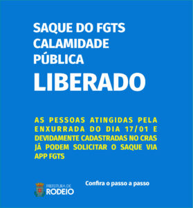 Rodeio – Liberado o saque do FGTS para as famílias diretamente atingidas pelas fortes chuvas registradas em 17/01/2023
