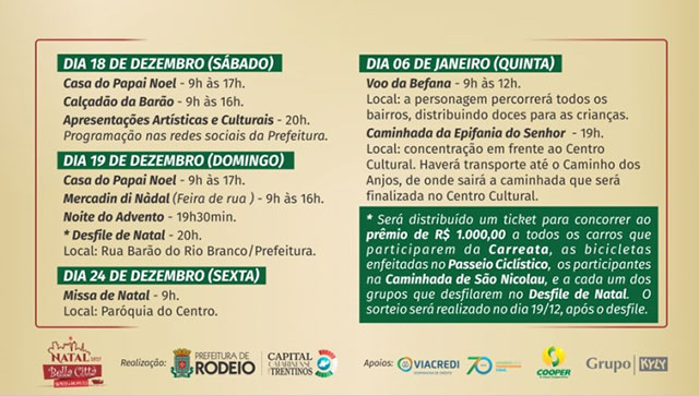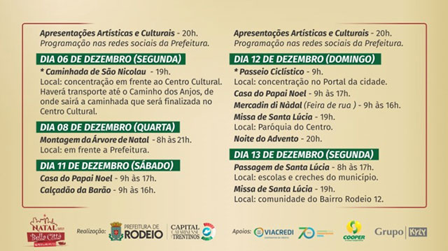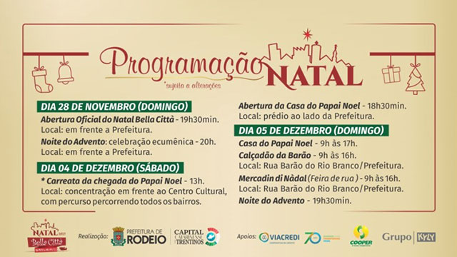 Diante deste cenário, a Prefeitura de Rodeio está assumindo para si a responsabilidade de envolver e integrar responsavelmente a população local em torno de uma programação baseada na promoção do “espírito natalino” de nascimento de um novo período.