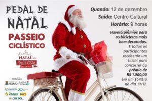 Enfeite sua bicicleta com decoração natalina e vá pedalar junto com o Papai Noel no Passeio Ciclístico do Natal Bella Città. A concentração será no Centro Cultural as 9 horas de Domingo dia 12 de dezembro.