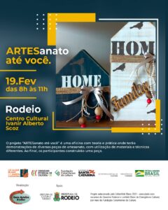 No dia 19 de Fevereiro, das 8h às 11h, será executado o Projeto “ARTESanato até você”, levando conhecimento aos pequenos artesãos locais, através de técnicas e materiais que chegam com atraso nos pequenos centros.