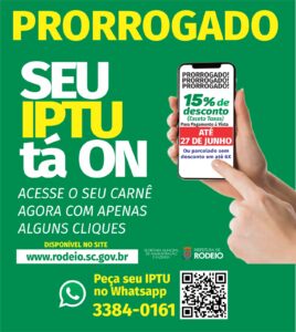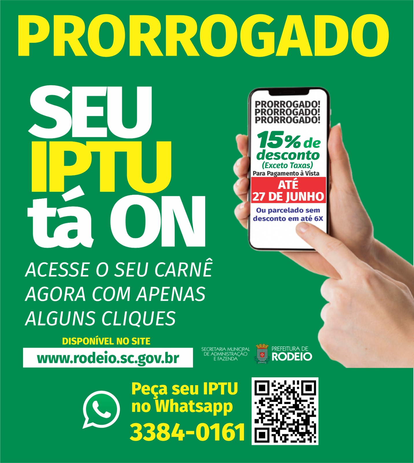 A Prefeitura de Rodeio informa que, devido a motivos especiais, foram estabelecidas novas datas para o pagamento do Imposto Predial e Territorial Urbano (IPTU) e da Taxa de Coleta de Resíduos Sólidos.