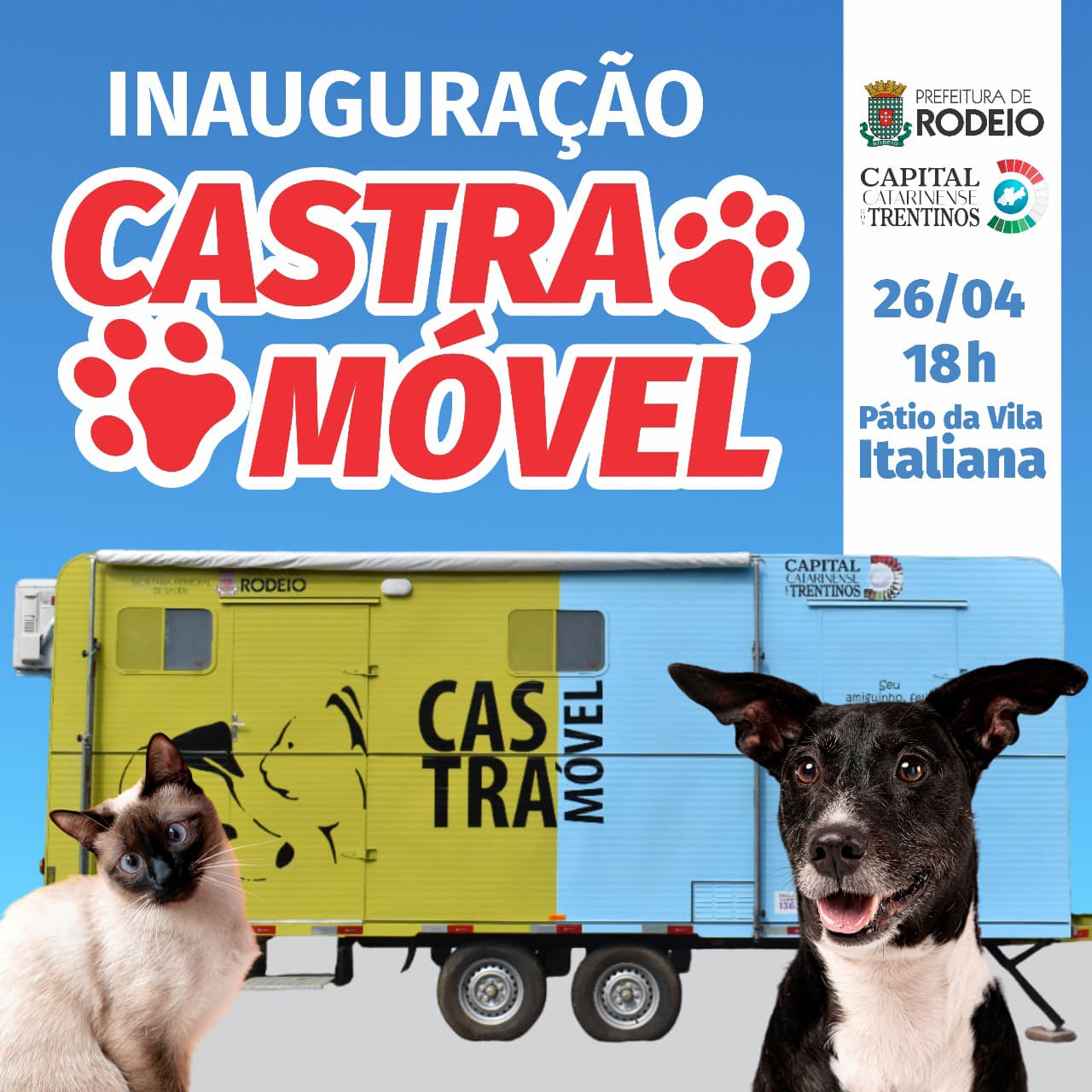 É com muita alegria que as Secretarias de Saúde e Agricultura/Meio Ambiente da Prefeitura de Rodeio convidam a todos para participarem do Cerimonial de Inauguração do Serviço de Castramóvel!