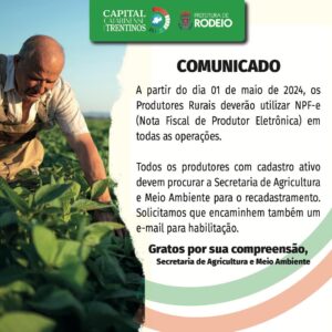 A Secretaria de Agricultura e Meio Ambiente vem por meio deste informar aos Produtores Rurais que a partir de 01 de maio de 2024, todas as operações realizadas devem utilizar a Nota Fiscal de Produtor Eletrônica.