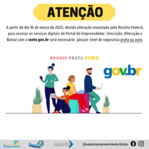 A Sala do Empreendedor informa que desde o dia 16 de março, para acessar os serviços digitais do Portal do Empreendedor, é necessário possuir nível de segurança prata ou ouro no aplicativo gov.br, seja para inscrição, alteração ou baixa do MEI.