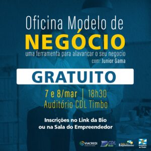 Nos dias 7 e 8 de março, a Sala do Empreendedor, em parceria com a Viacredi e a CDL, promove a oficina Modelo de Negócio. Ela acontece nos dois dias das 18h30 às 21h30, no Auditório da CDL Timbó, na Rua Japão, 444. A inscrição é gratuita.