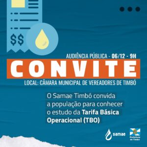 No dia 6 de dezembro, às 9h, no auditório da Câmara de Vereadores de Timbó, acontece a audiência pública na qual o SAMAE irá apresentar o projeto da Tarifa Básica Operacional (TBO), modelo que está sendo proposto e elimina a cobrança mínima por 10 mil litros das tarifas de água do SAMAE, tornando a cobrança mais justa e incentivando as pessoas a economizarem água.