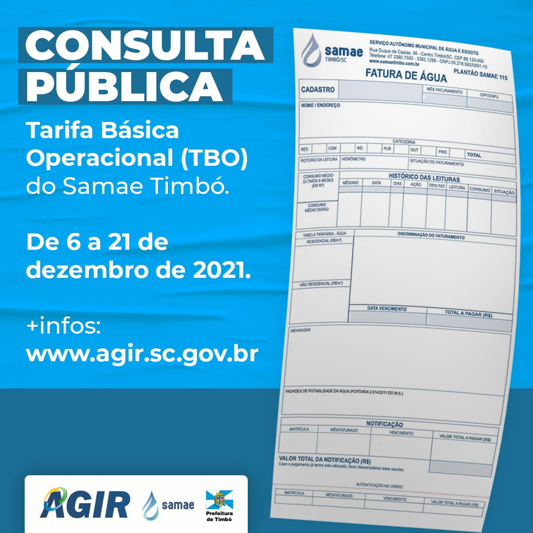 Entre os dias 6 e 21 de dezembro de 2021, a Agência Intermunicipal de Regulação do Médio Vale do Itajaí (AGIR) realiza a consulta pública para ouvir a população quanto ao projeto da Tarifa Básica Operacional (TBO), modelo que está sendo proposto e elimina a cobrança mínima por 10 mil litros das tarifas de água do SAMAE Timbó, tornando a cobrança mais justa e incentivando as pessoas a economizarem água.