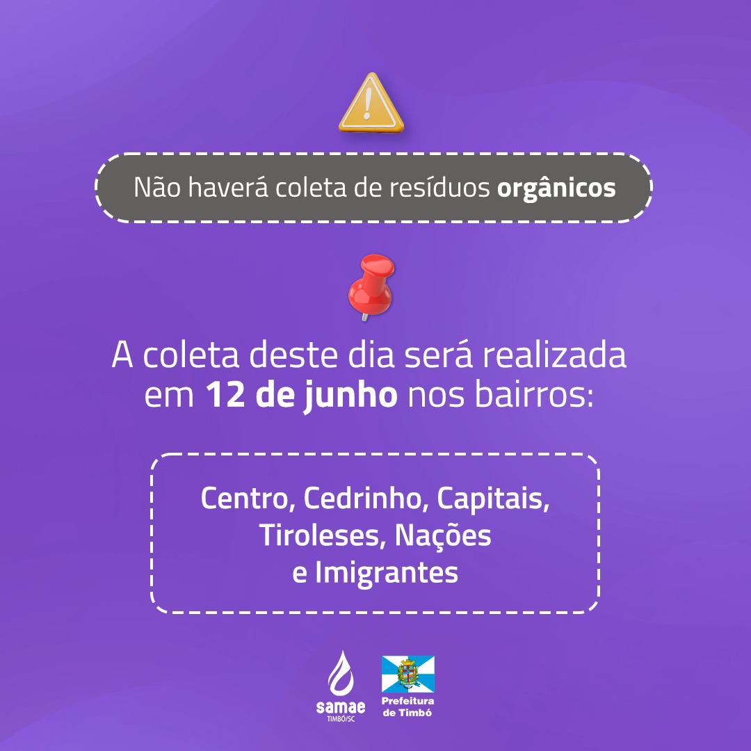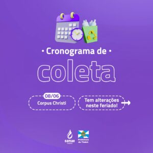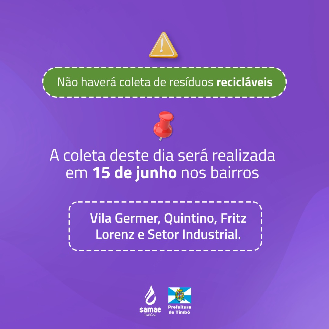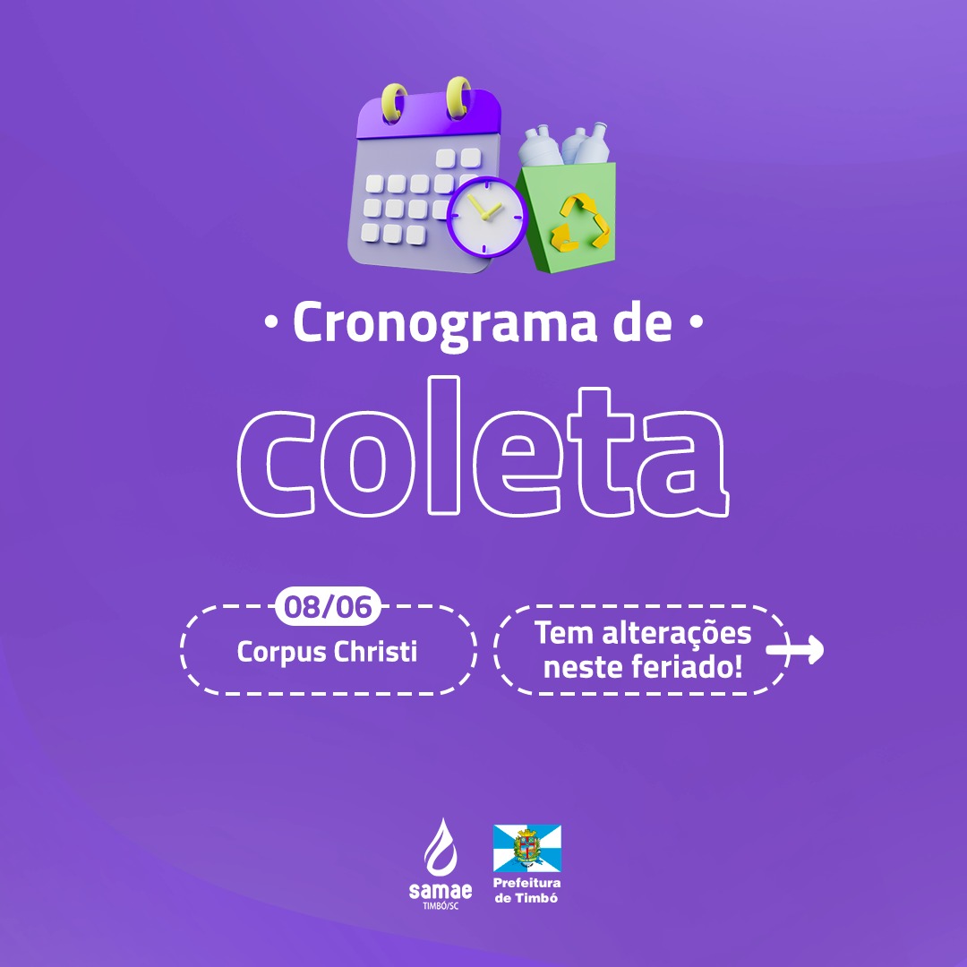 O SAMAE Timbó informa que, devido ao feriado nacional de Corpus Christi nesta quinta-feira, dia 08 de junho, o cronograma de coletas no município de Timbó irá ter alterações: