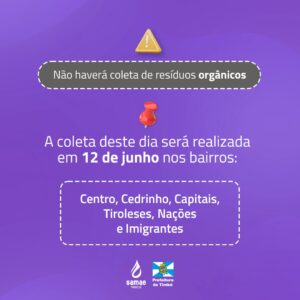 Coleta de Resíduos Orgânicos – NÃO HAVERÁ COLETA. A coleta deste dia será realizada em 12 de junho nos bairros Centro, Cedrinho, Capitais, Tiroleses, Nações e Imigrantes.