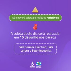 Coleta de Resíduos Recicláveis – NÃO HAVERÁ COLETA. A coleta deste dia será realizada em 15 de junho nos bairros Vila Germer, Quintino, Fritz Lorenz e Setor Industrial.