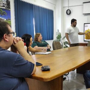 Eles foram recebidos pelo coordenador do Setor Técnico do SAMAE, Rodrigo Catafesta Francisco, e a estagiária Maike Letícia Link, que realizaram uma apresentação voltada aos seguintes temas: