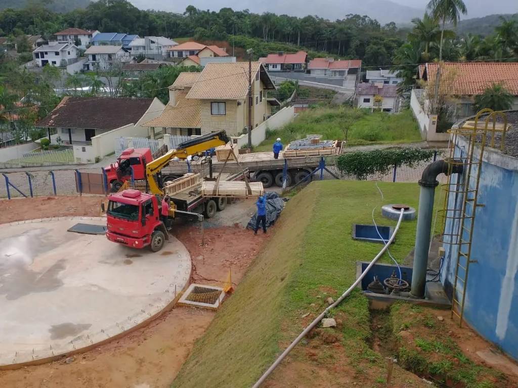 No início desta tarde, 1º de setembro, começaram a chegar os caminhões com peças para fazer a montagem do novo reservatório do SAMAE Timbó, que vai acontecer na Estação de Tratamento de Água (ETA), no Bairro das Capitais, que está prevista para iniciar de fato no dia 7 de Setembro.