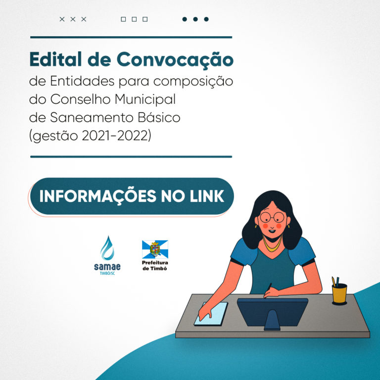 O Samae Timbó torna público o Edital de Convocação de entidades não governamentais para a composição do Conselho Municipal de Saneamento Básico de Timbó para a Gestão 2021-2022 dos seguintes segmentos:
