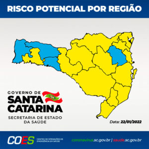 A Matriz de Risco Potencial Regionalizado divulgada neste sábado, 22, aponta 13 regiões classificadas como risco potencial alto (cor amarelo) e quatro no nível de risco moderado (cor azul). Em um comparativo com o relatório divulgado na semana anterior, as regiões do Extremo Oeste, Médio Vale do Itajaí e Xanxerê, que estavam classificadas no nível alto (amarelo), tiveram melhora nos indicadores e passaram a ser classificados no nível moderado (azul), juntando-se ao Alto Uruguai Catarinense. Já o Vale do Itapocú, que estava no nível moderado (azul), teve piora na dimensão transmissibilidade, se juntando às regiões do Alto Vale do Itajaí, Alto Vale do Rio do Peixe, Carbonífera, Extremo Sul Catarinense, Foz do Rio Itajaí, Grande Florianópolis, Laguna, Meio Oeste, Nordeste, Oeste, Planalto Norte e Serra Catarinense que se mantiveram no nível alto (amarelo).