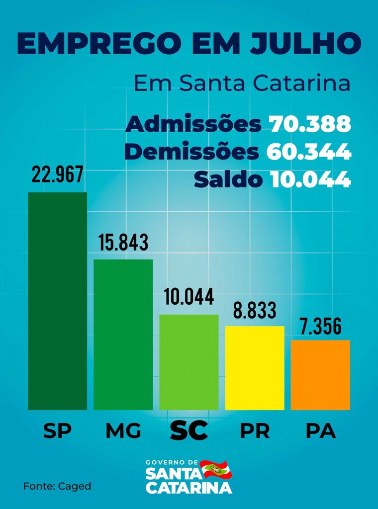 A economia catarinense encerrou o mês de julho com saldo de 10.044 novas vagas de emprego. O resultado é o melhor em 16 anos, desde que iniciou a série histórica, que analisa dados desde 2004. Também representa o maior saldo entre os estados do Sul e o terceiro na comparação com o restante do país, atrás apenas de São Paulo (22.967) e Minas Gerais (15.843). Os dados são do Cadastro Geral de Empregados e Desempregados (Caged), pesquisa divulgada nesta sexta-feira, 21, pelo Ministério da Economia.