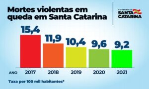 Santa Catarina teve mais um ano de redução nas mortes violentas em 2021. A taxa por 100 mil habitantes caiu de 9,6 para 9,2, conforme dados disponibilizados pelo Colegiado Superior de Segurança Pública e Perícia Oficial (CSSPPO). Com isso, o estado se consolida como o mais seguro do Sul do Brasil. Para efeito de comparação, o índice de mortes violentas nos estados vizinhos ficou em 14,5 no Rio Grande do Sul e 16,8 no Paraná. Em nível nacional, apenas São Paulo possui taxa menor (6,6).