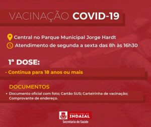A Secretaria de Saúde de Indaial dá continuidade à vacinação contra a Covid-19 em pessoas com 18 anos ou mais e demais grupos já liberados. Os usuários podem se dirigir à Central de Vacinação instalada no Parque Municipal Jorge Hardt, de segunda a sexta, das 8h às 16h30, com atendimento por ordem de chegada. É necessário apresentar carteirinha de vacinação, Cartão do SUS e documento oficial com foto.