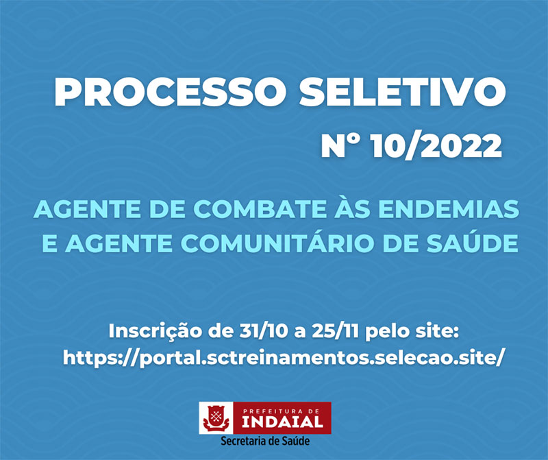 A Prefeitura de Indaial, através da Secretaria de Saúde, lançou o processo seletivo nº 010/2022, destinado à contratação, por prazo indeterminado, para preenchimento de vagas de empregos públicos existente e formação de cadastro reserva. As vagas são para Agente de Combate às Endemias (ACE) e Agente Comunitário de Saúde (ACS).