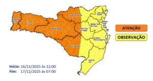 Atenção Meteorológica SDC/SC 15/11 08:30 – Temporais e chuva pontualmente intensa entre a tarde de domingo (16) e a manhã de segunda-feira (17)