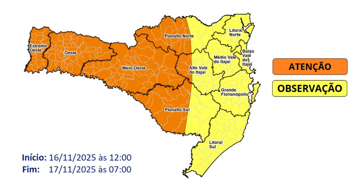 Entre a tarde de domingo (16) e a manhã da segunda-feira (17), a aproximação e avanço de uma frente fria, favorece a ocorrência de temporais em Santa Catarina. Os temporais vem acompanhados por raios, rajadas de vento, chuva pontualmente intensa e eventual queda de granizo, oferecendo risco moderado a alto para ocorrências associadas à destelhamentos, danos na rede elétrica, queda de galhos e árvores, alagamentos e enxurradas pontuais.