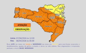 A chuva e os temporais começam pelo Extremo Oeste, Oeste e Meio-Oeste, regiões próximas à divisa com o RS, no início da tarde e avançam pelas demais regiões – Planalto Sul, Litoral Sul, Planaltos, Grd. Florianópolis, Vale do Itajaí e Litoral Norte, ao longo da tarde e noite de terça (07) e também na madrugada de quarta (08).