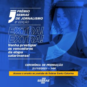 O Sebrae/SC divulgou nesta sexta-feira, 15 de outubro, os finalistas da etapa estadual da 8ª edição do Prêmio Sebrae de Jornalismo. O Prêmio é dividido em quatro categorias: vídeo, áudio, texto e foto, e irá premiar as melhores reportagens com temáticas que englobam o universo dos pequenos negócios: empreendedorismo, produtividade e competitividade, inovação e startups, inclusão produtiva e sustentabilidade, transformação digital, políticas públicas e legislação e acesso a crédito. Os vencedores serão conhecidos durante uma cerimônia de premiação no formato híbrido, presencial e remoto, que será realizada no dia 21 de outubro, às 14h. Para acompanhar on-line basta acessar o link http://sebrae.sc/premiacao-psj