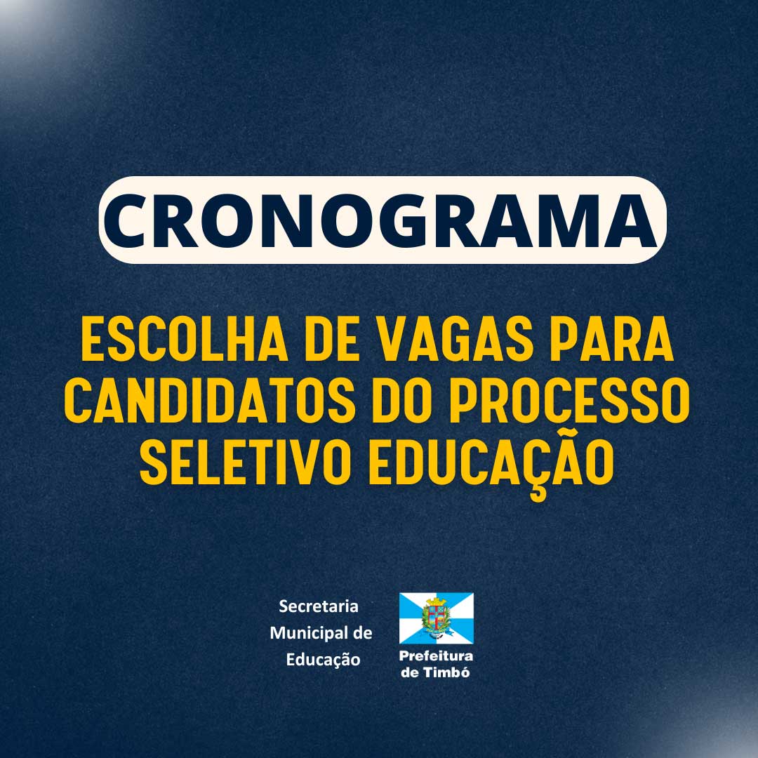 A Secretaria de Educação de Timbó divulga abaixo cronograma para que os profissionais candidatos do processo seletivo de concurso escolham as vagas. Acesse aqui os editais de convocação, com os nomes dos habilitados.