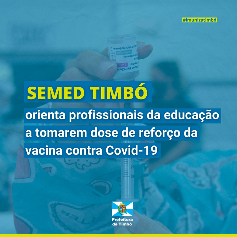 A Secretaria de Educação de Timbó informa que os profissionais da Educação devem tomar a terceira dose (dose de reforço) da vacina contra Covid-19. Estas orientações foram recebidas nesta semana através do governo estadual, na Portaria Normativa Conjunta SES/SED/DCSC nº 79, de 18 de janeiro de 2022.