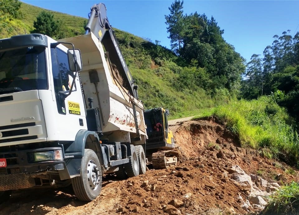 Nesta segunda-feira, dia 03 de abril, a Secretaria de Obras de Timbó retomou os serviços de recuperação da via na Estrada Geral da Mulde, entre as Tifas Krueger e Morgenland.
