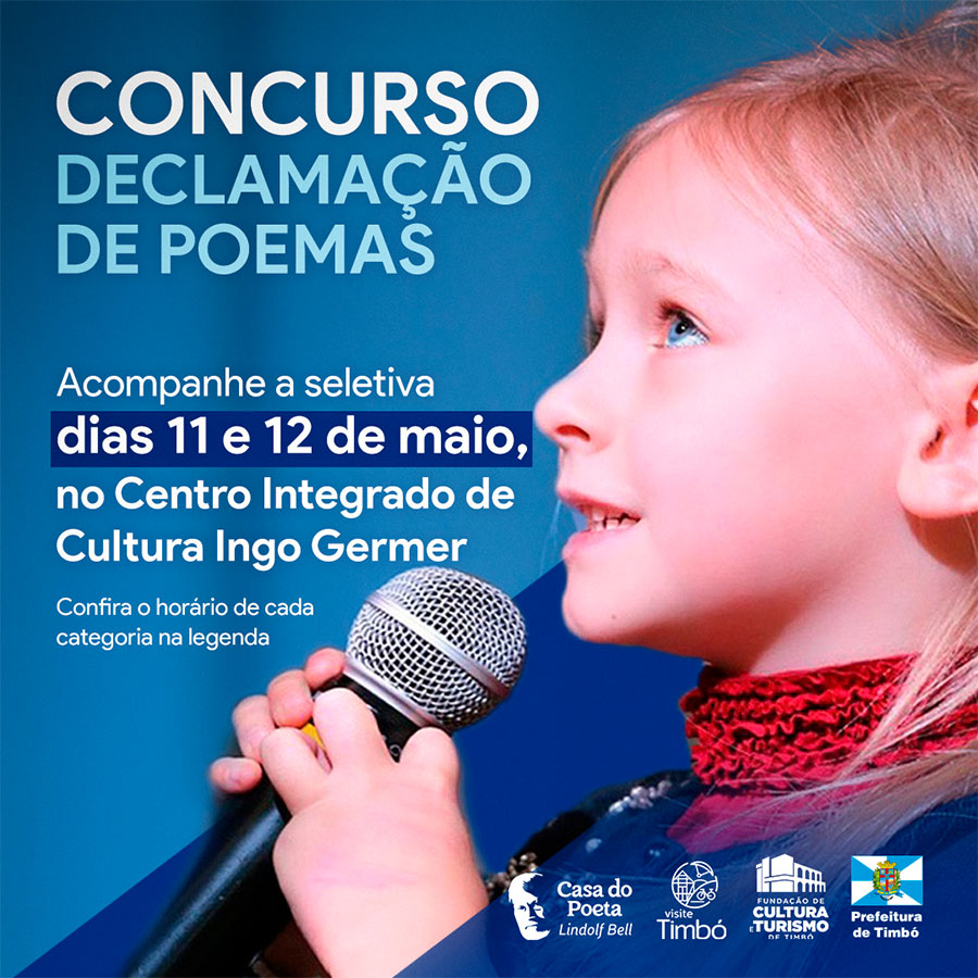 O 13º Concurso de Declamação de Poemas de Timbó chega a mais uma etapa. Com mais de 180 inscrições, nesta quinta e sexta-feira, dia 11 e 12 de maio, acontecem as seletivas. Serão selecionadas cinco pessoas de cada categoria.