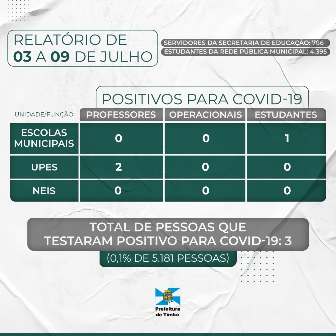 Prezando pela transparência na divulgação dos dados, a Prefeitura de Timbó, através da Secretaria Municipal de Educação (Semed), emite um relatório semanal de casos de Covid-19 na rede pública municipal de ensino.