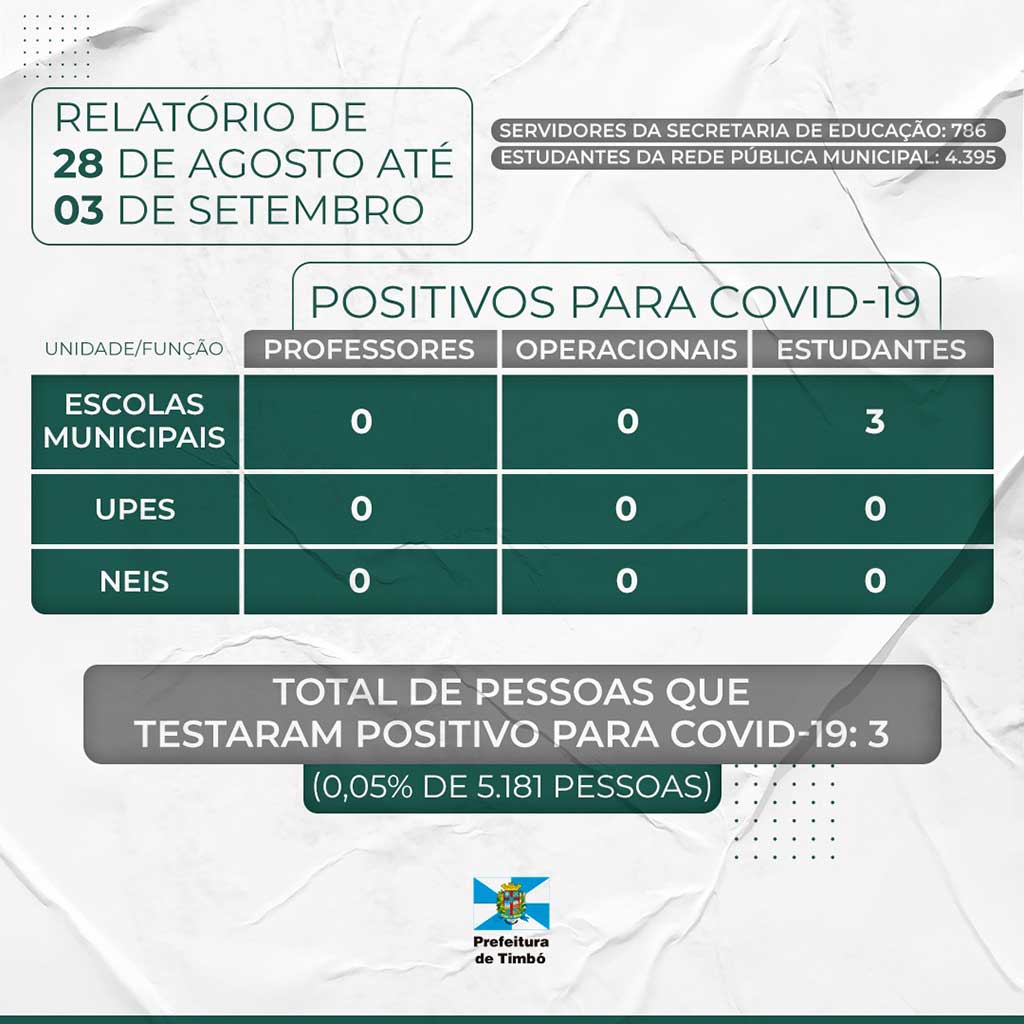 Prezando pela transparência na divulgação dos dados, a Prefeitura de Timbó, através da Secretaria Municipal de Educação (Semed), emite um relatório semanal de casos de Covid-19 na rede pública municipal de ensino.