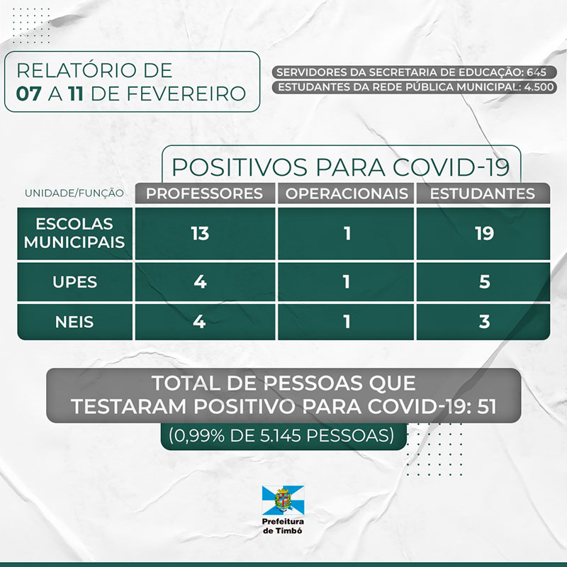 Com o retorno das aulas na rede municipal de ensino na última semana, retornamos com o relatório semanal de casos de Covid-19. A Prefeitura de Timbó, através da Secretaria Municipal de Educação (Semed), emite este relatório prezando pela transparência na divulgação dos dados.