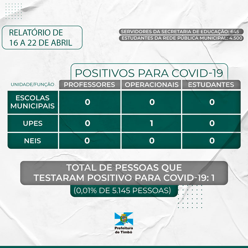 Semed Timbó divulga relatório de casos da Covid-19 na rede pública municipal de ensino