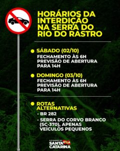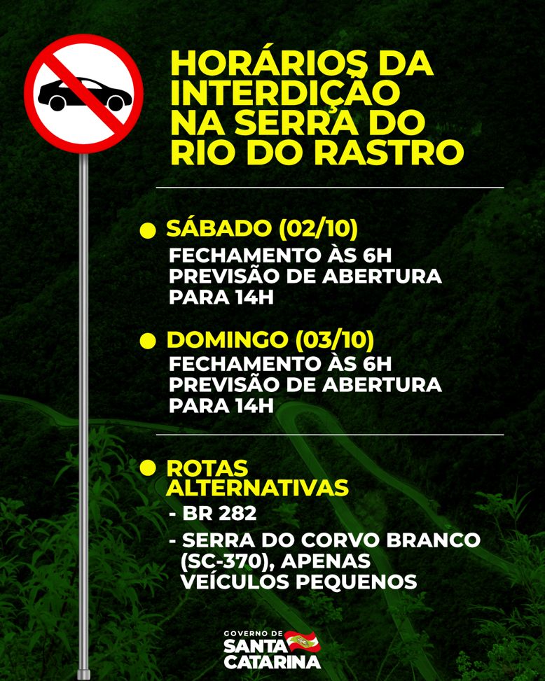 Motoristas que precisem subir ou descer a Serra nestes horários poderão usar como alternativas a BR-282, ou a Serra do Corvo Branco (SC-370), no caso de veículos pequenos.