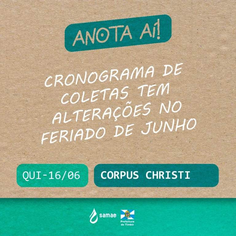 O SAMAE Timbó informa que com o feriado, o cronograma de coletas no município de Timbó irá ter alterações: